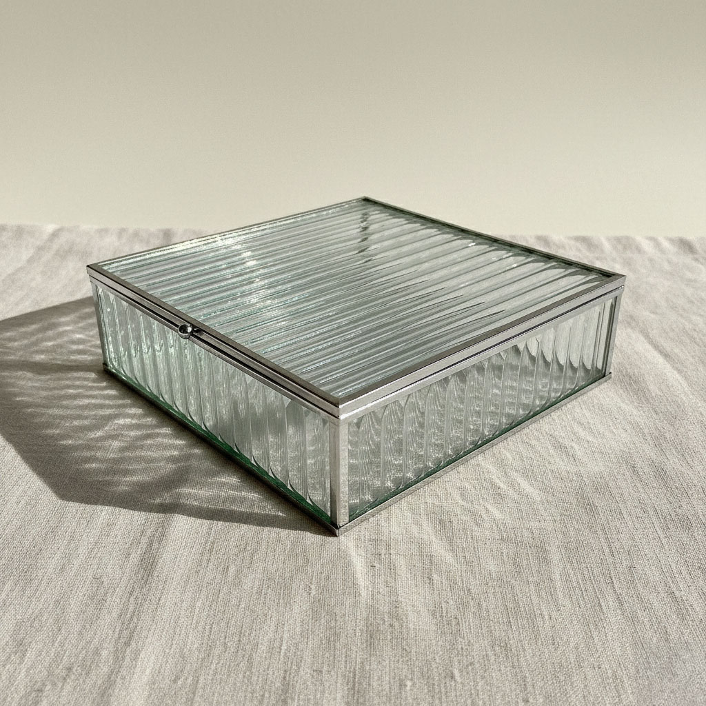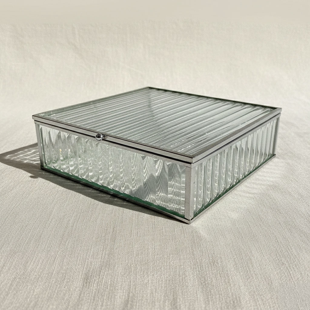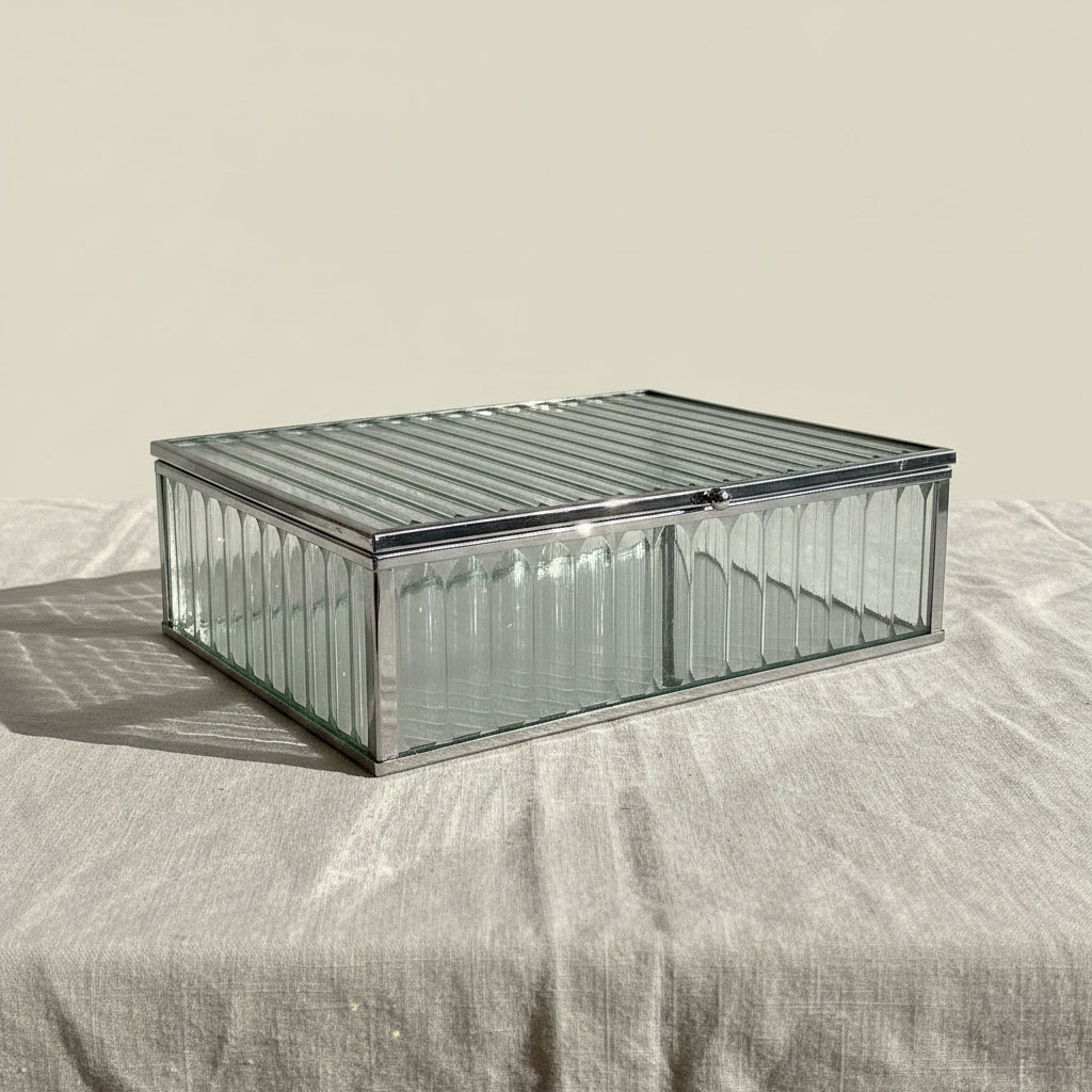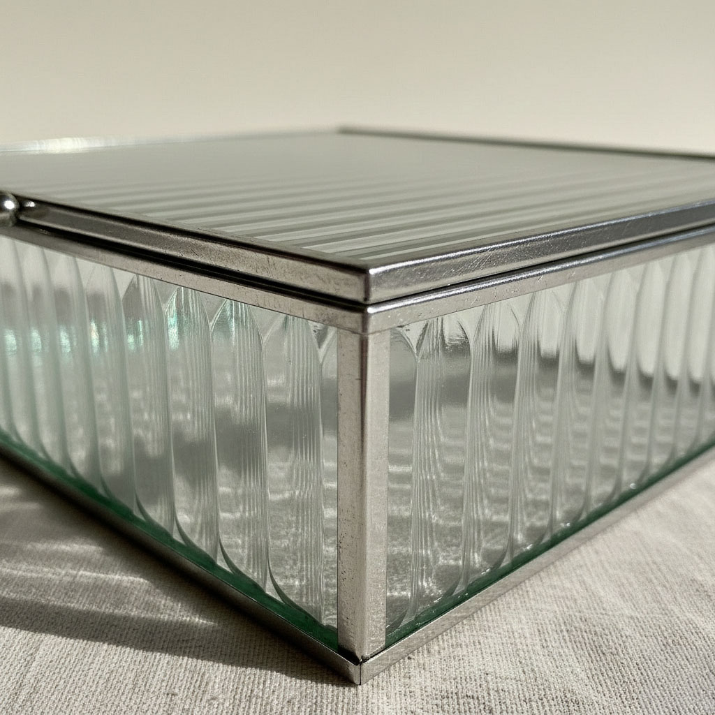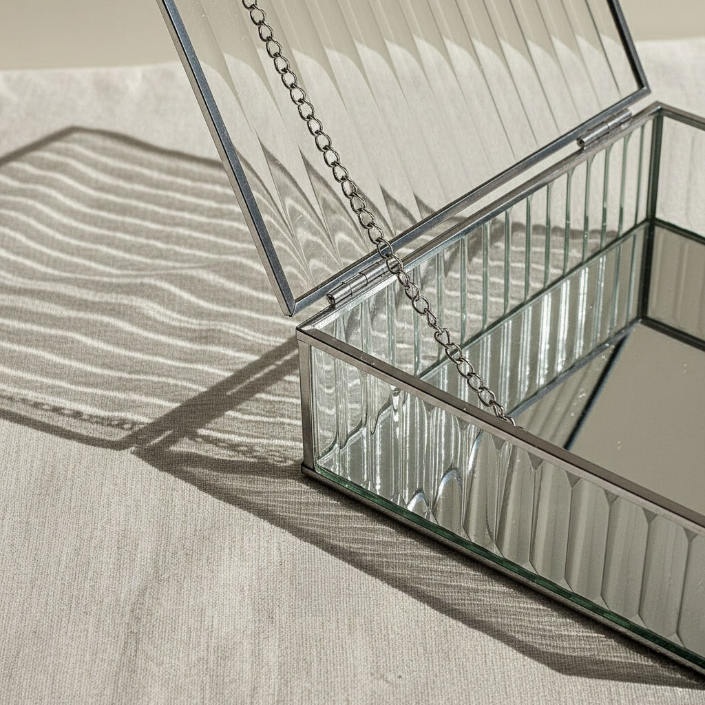 The “Silver Flute” Jewelry Box is a modern tribute to Art Deco design. The distinctive striped (fluted) glass creates a rhythmic play of light and shadow, offering a sophisticated way to store and display your cherished accessories. The sleek silver-plated finish adds a cool, contemporary edge to this timeless silhouette.