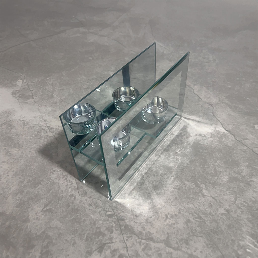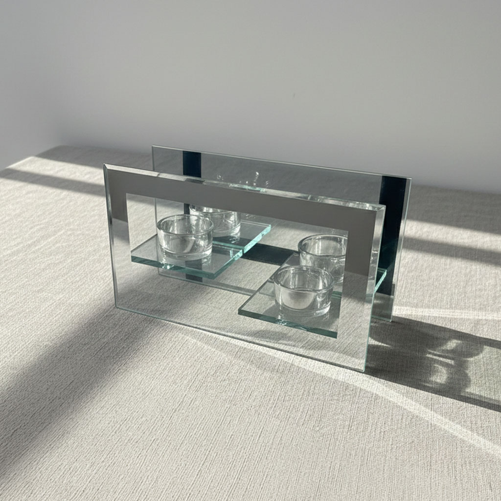 Infinite Radiance for Modern Interiors. This contemporary candle holder features a stunning mirrored back panel that amplifies the warm glow of two suspended tea light bowls. Crafted from premium high-clarity glass and reflective panels, its architectural design creates a captivating display of light and shadow. Perfect as a sophisticated centerpiece for dining tables, mantels, or as a luxurious gift for modern home enthusiasts.