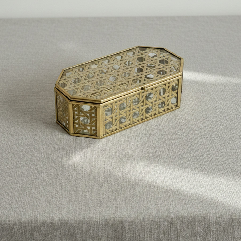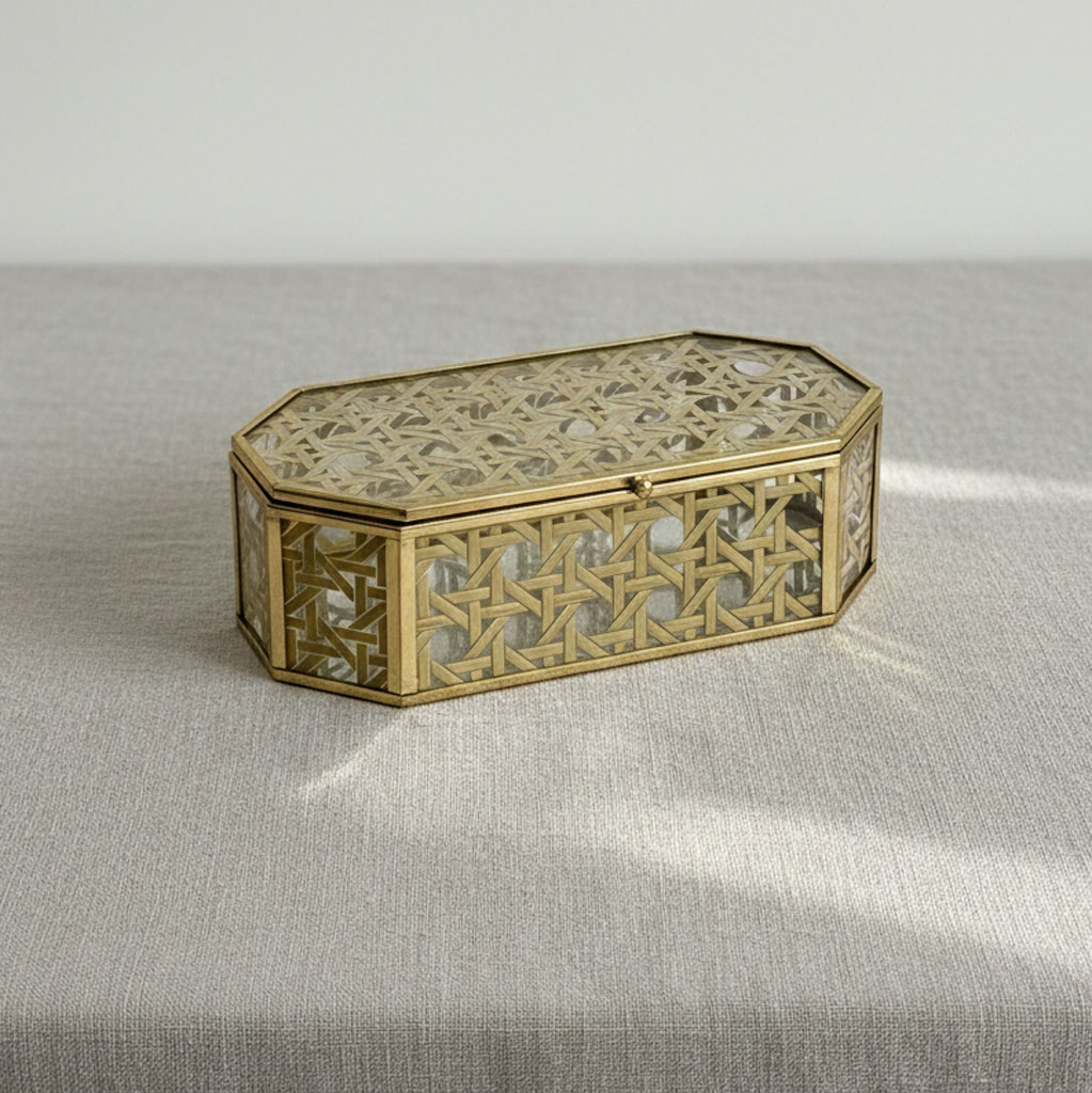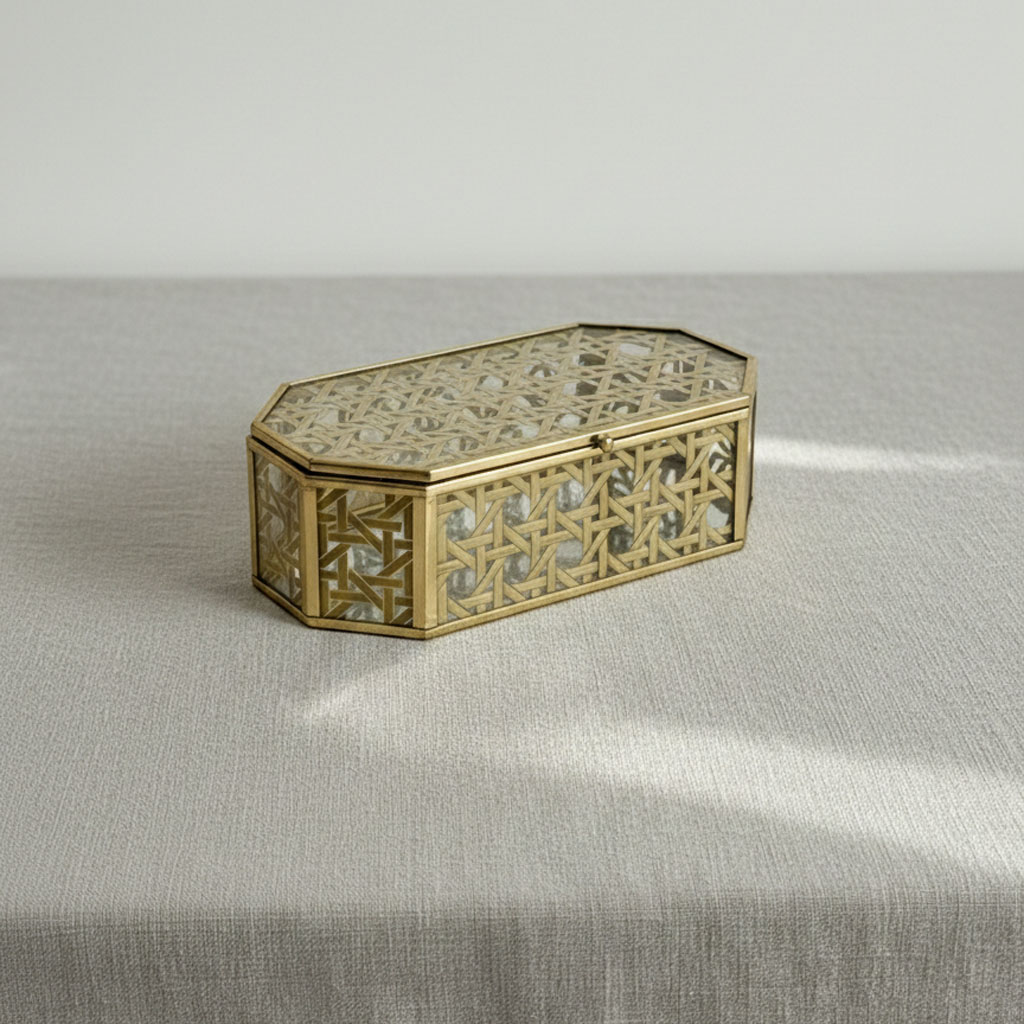 Artisan Craftsmanship Meets Geometric Style. This stunning octagonal jewelry box is a masterpiece of precision, featuring a sophisticated mesh-patterned silk-screen print on high-clarity glass. Encased in a handcrafted gold-finished metal frame, its unique geometric silhouette creates a captivating interplay of light and texture. Perfect for safeguarding your cherished rings and accessories while adding a vintage, artisan touch to your vanity or shelf.