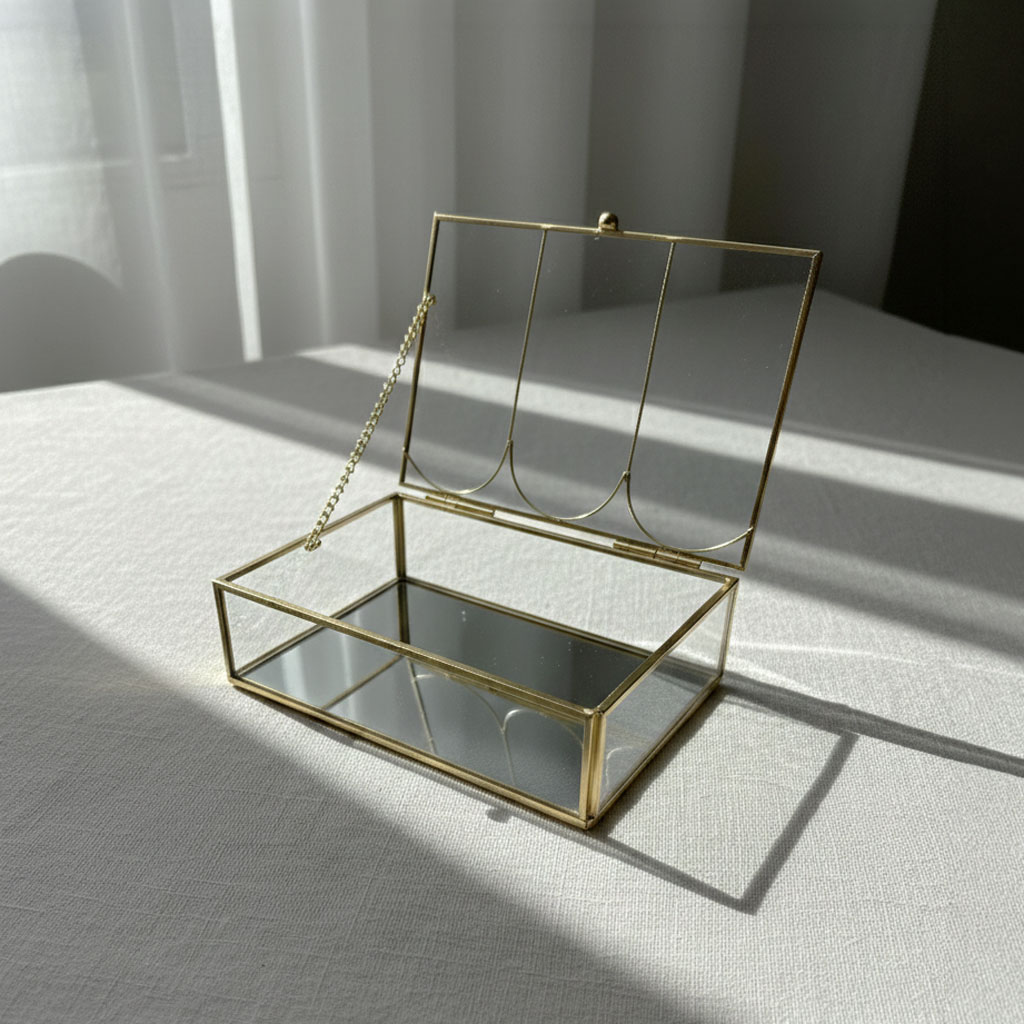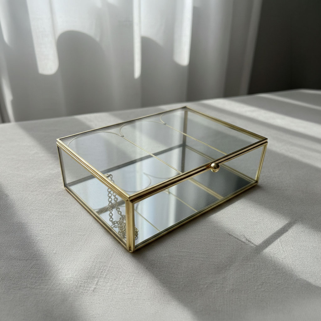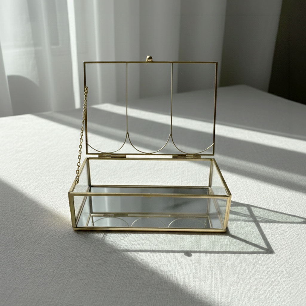 The “Mermaid” Keepsake Box is a delicate blend of linear precision and curved grace. The signature scalloped copper detailing on the glass lid creates a rhythmic visual flow, while the mirrored base ensures your jewelry is displayed with maximum radiance. It’s a petite yet powerful statement piece for any curated vanity.